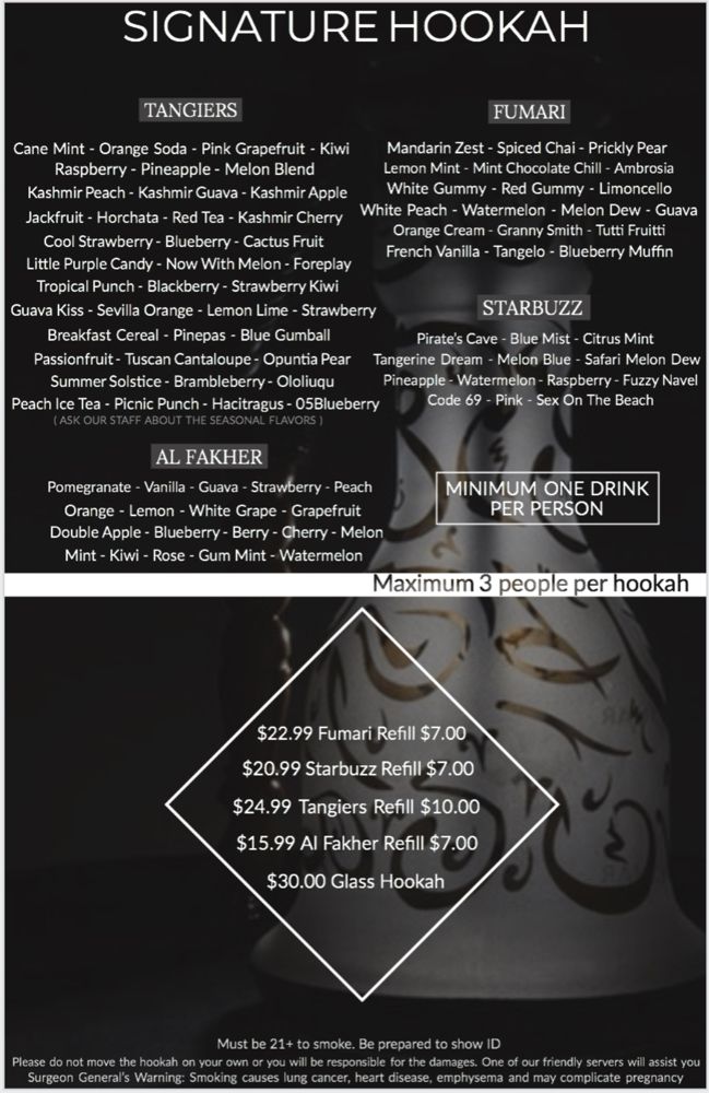 Introducing the menu at Signature Hookah, a hidden gem nestled in Sunland, CA. This vibrant hookah lounge has garnered rave reviews for its exceptional hospitality and a relaxing atmosphere. With a focus on top-notch Tangiers hookah flavors, guests can indulge in an array of carefully curated options that cater to even the most discerning enthusiasts.